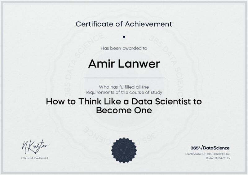 This user has been awarded the How to Think Like a Data Scientist to Become One Certificate for successfully completing the course exam. Holding this certificate demonstrates their proficiency on the topic and signifies they are qualified to apply their newly acquired expertise in the fields of data analytics and data science.