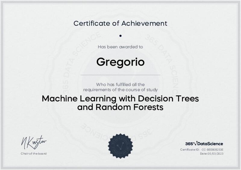 This user has been awarded the Machine Learning with Decision Trees and Random Forests Certificate for successfully completing the course exam. Holding this certificate demonstrates their proficiency on the topic and signifies they are qualified to apply their newly acquired expertise in the fields of data analytics and data science.