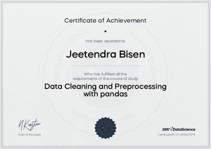 This user has been awarded the Data Cleaning and Preprocessing with pandas Certificate for successfully completing the course exam. Holding this certificate demonstrates their proficiency on the topic and signifies they are qualified to apply their newly acquired expertise in the fields of data analytics and data science.