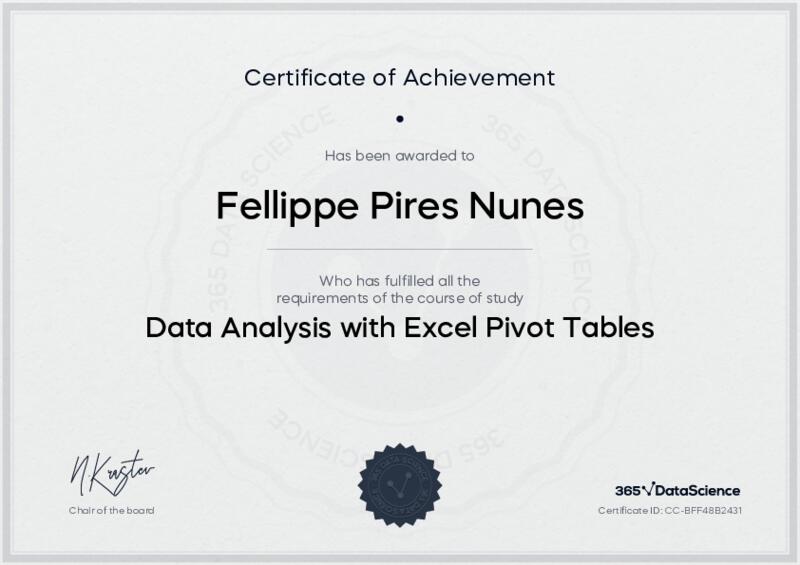 This user has been awarded the Data Analysis with Excel Pivot Tables Certificate for successfully completing the course exam. Holding this certificate demonstrates their proficiency on the topic and signifies they are qualified to apply their newly acquired expertise in the fields of data analytics and data science.