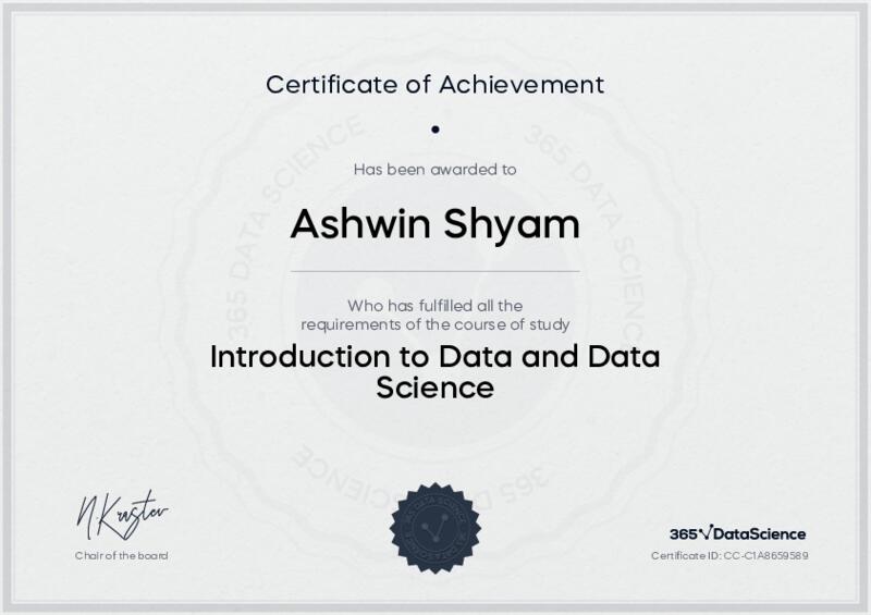 This user has been awarded the Introduction to Data and Data Science Certificate for successfully completing the course exam. Holding this certificate demonstrates their proficiency on the topic and signifies they are qualified to apply their newly acquired expertise in the fields of data analytics and data science.