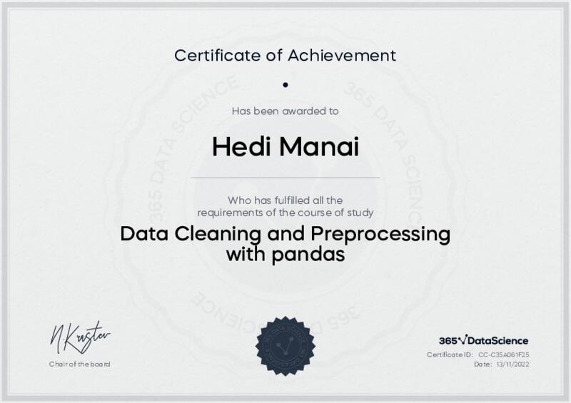 This user has been awarded the Data Cleaning and Preprocessing with pandas Certificate for successfully completing the course exam. Holding this certificate demonstrates their proficiency on the topic and signifies they are qualified to apply their newly acquired expertise in the fields of data analytics and data science.