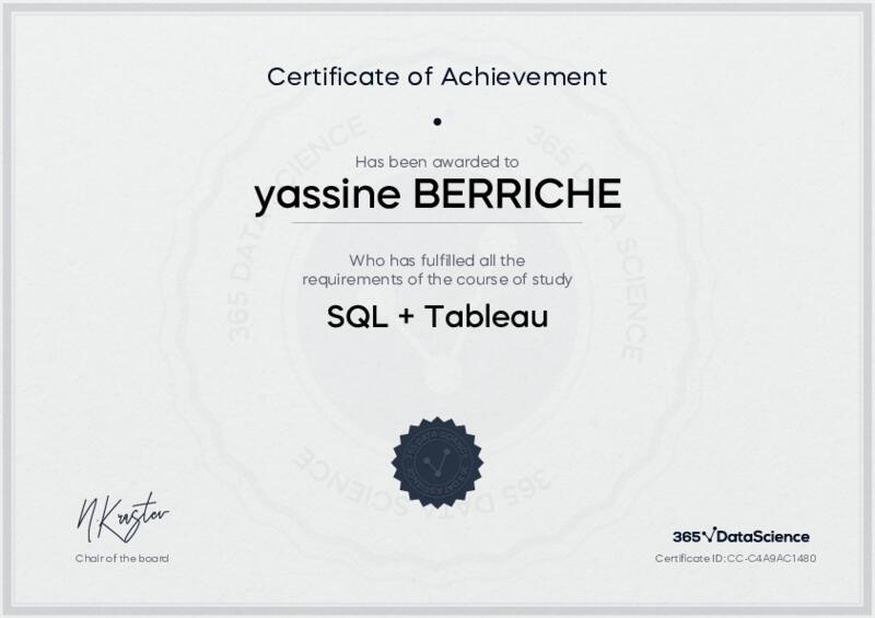 This user has been awarded the SQL + Tableau Certificate for successfully completing the course exam. Holding this certificate demonstrates their proficiency on the topic and signifies they are qualified to apply their newly acquired expertise in the fields of data analytics and data science.