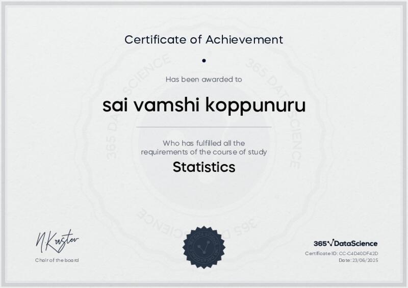 This user has been awarded the Statistics Certificate for successfully completing the course exam. Holding this certificate demonstrates their proficiency on the topic and signifies they are qualified to apply their newly acquired expertise in the fields of data analytics and data science.
