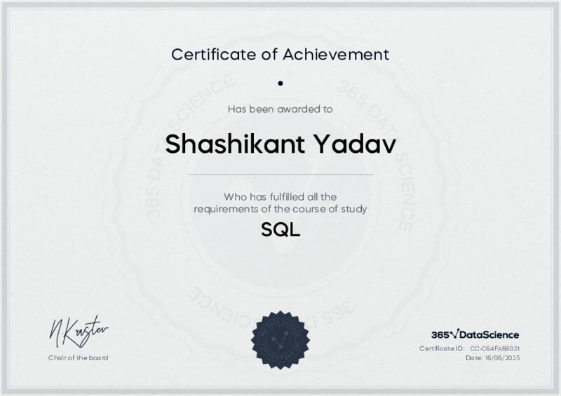 This user has been awarded the SQL Certificate for successfully completing the course exam. Holding this certificate demonstrates their proficiency on the topic and signifies they are qualified to apply their newly acquired expertise in the fields of data analytics and data science.