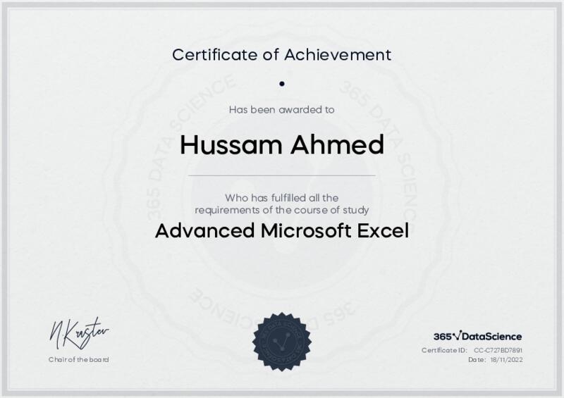 This user has been awarded the Advanced Microsoft Excel Certificate for successfully completing the course exam. Holding this certificate demonstrates their proficiency on the topic and signifies they are qualified to apply their newly acquired expertise in the fields of data analytics and data science.