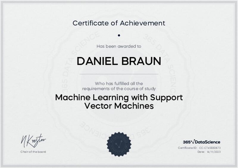 This user has been awarded the Machine Learning with Support Vector Machines Certificate for successfully completing the course exam. Holding this certificate demonstrates their proficiency on the topic and signifies they are qualified to apply their newly acquired expertise in the fields of data analytics and data science.