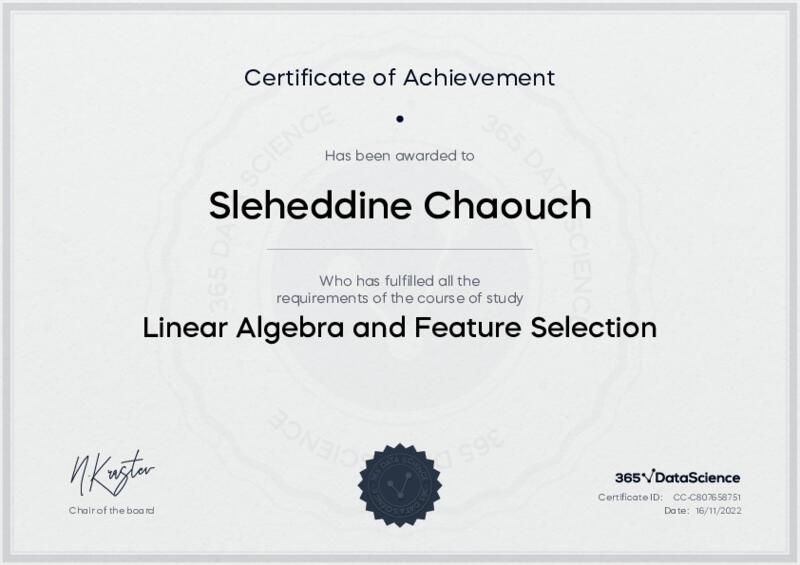 This user has been awarded the Linear Algebra and Feature Selection Certificate for successfully completing the course exam. Holding this certificate demonstrates their proficiency on the topic and signifies they are qualified to apply their newly acquired expertise in the fields of data analytics and data science.