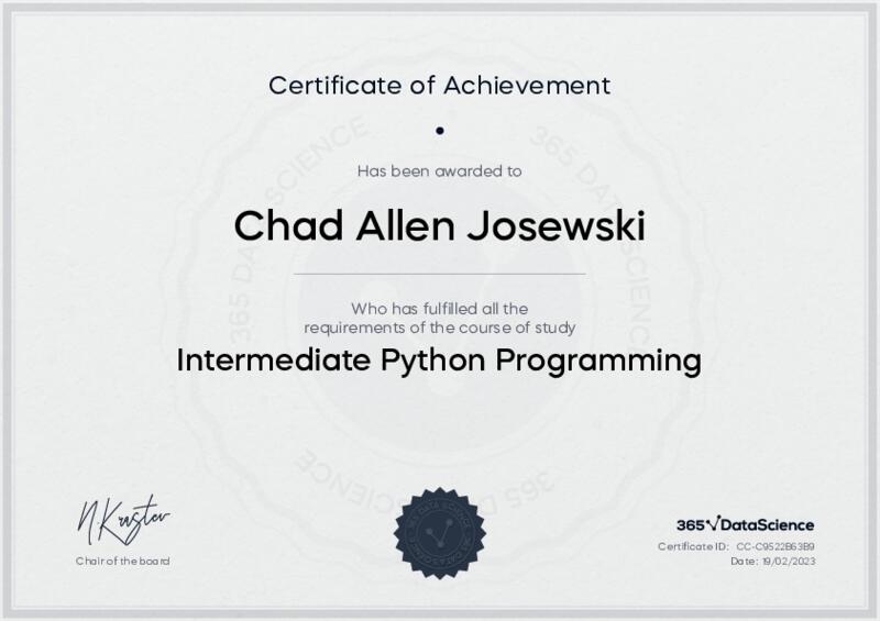This user has been awarded the Intermediate Python Programming Certificate for successfully completing the course exam. Holding this certificate demonstrates their proficiency on the topic and signifies they are qualified to apply their newly acquired expertise in the fields of data analytics and data science.