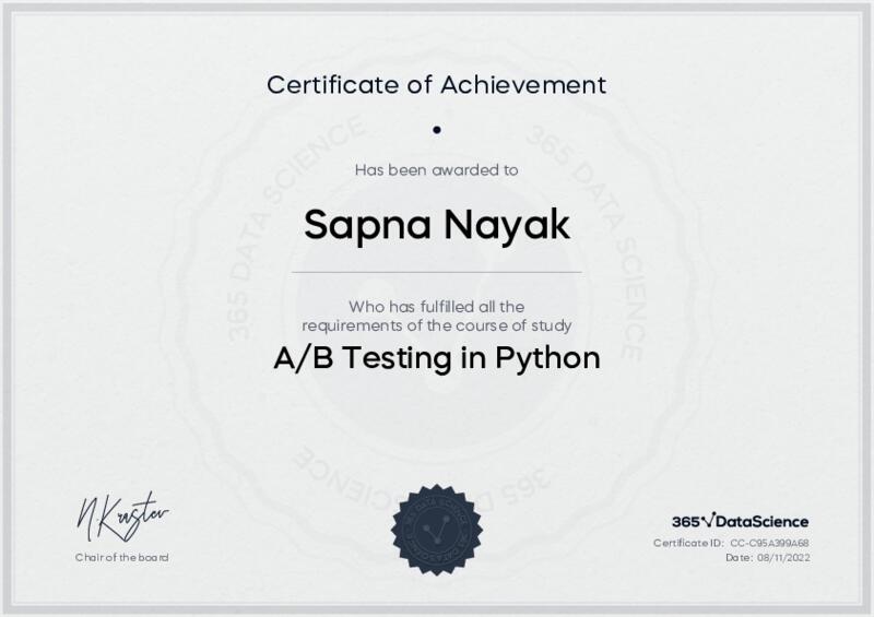 This user has been awarded the A/B Testing in Python Certificate for successfully completing the course exam. Holding this certificate demonstrates their proficiency on the topic and signifies they are qualified to apply their newly acquired expertise in the fields of data analytics and data science.