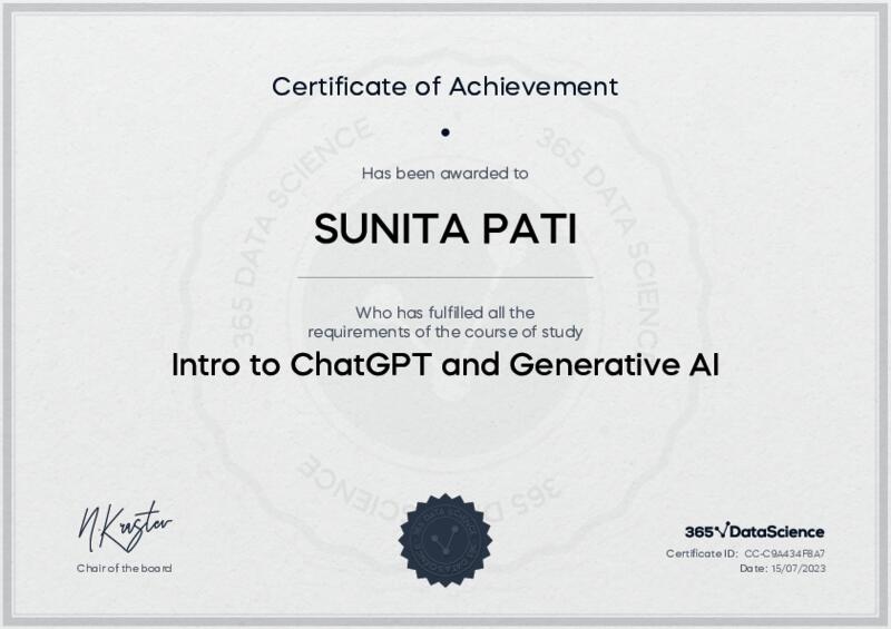 This user has been awarded the Intro to ChatGPT and Generative AI Certificate for successfully completing the course exam. Holding this certificate demonstrates their proficiency on the topic and signifies they are qualified to apply their newly acquired expertise in the fields of data analytics and data science.