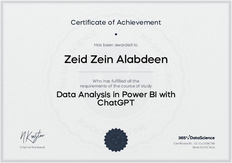 This user has been awarded the Data Analysis in PowerBI with ChatGPT Certificate for successfully completing the course exam. Holding this certificate demonstrates their proficiency on the topic and signifies they are qualified to apply their newly acquired expertise in the fields of data analytics and data science.