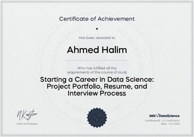 This user has been awarded the Starting a Career in Data Science: Project Portfolio, Resume, and Interview Process Certificate for successfully completing the course exam. Holding this certificate demonstrates their proficiency on the topic and signifies they are qualified to apply their newly acquired expertise in the fields of data analytics and data science.