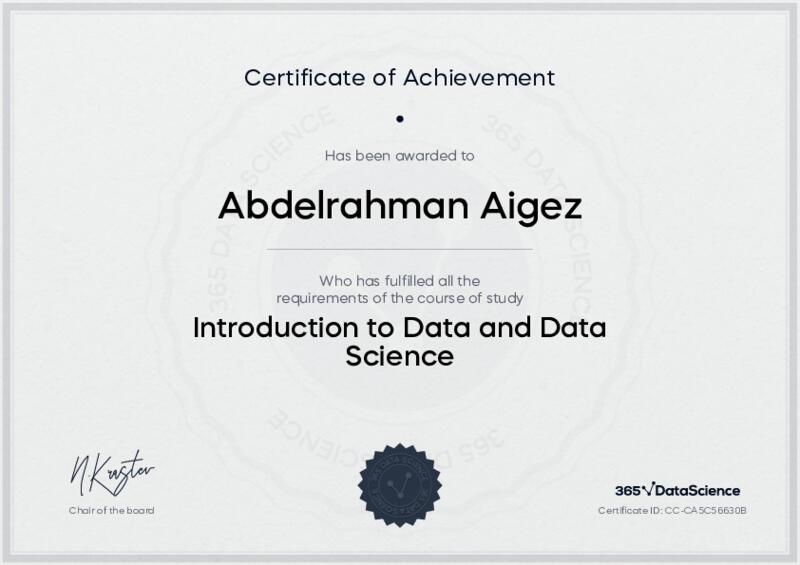 This user has been awarded the Introduction to Data and Data Science Certificate for successfully completing the course exam. Holding this certificate demonstrates their proficiency on the topic and signifies they are qualified to apply their newly acquired expertise in the fields of data analytics and data science.