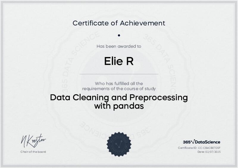 This user has been awarded the Data Cleaning and Preprocessing with pandas Certificate for successfully completing the course exam. Holding this certificate demonstrates their proficiency on the topic and signifies they are qualified to apply their newly acquired expertise in the fields of data analytics and data science.