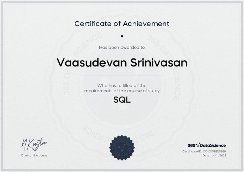 This user has been awarded the SQL Certificate for successfully completing the course exam. Holding this certificate demonstrates their proficiency on the topic and signifies they are qualified to apply their newly acquired expertise in the fields of data analytics and data science.