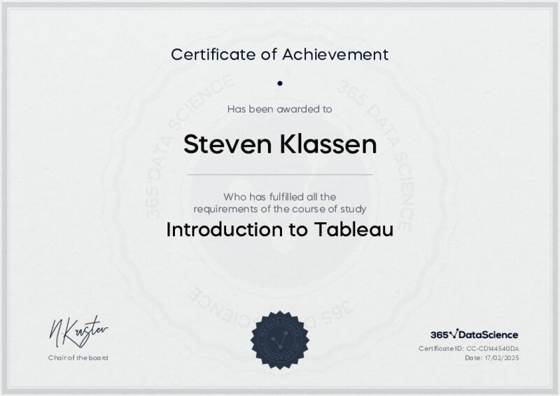This user has been awarded the Introduction to Tableau Certificate for successfully completing the course exam. Holding this certificate demonstrates their proficiency on the topic and signifies they are qualified to apply their newly acquired expertise in the fields of data analytics and data science.