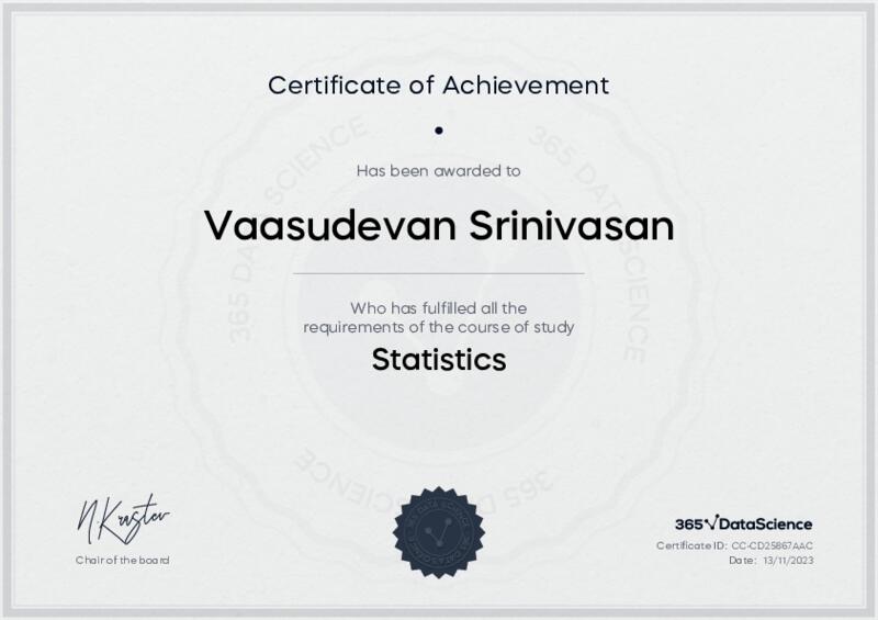 This user has been awarded the Statistics Certificate for successfully completing the course exam. Holding this certificate demonstrates their proficiency on the topic and signifies they are qualified to apply their newly acquired expertise in the fields of data analytics and data science.