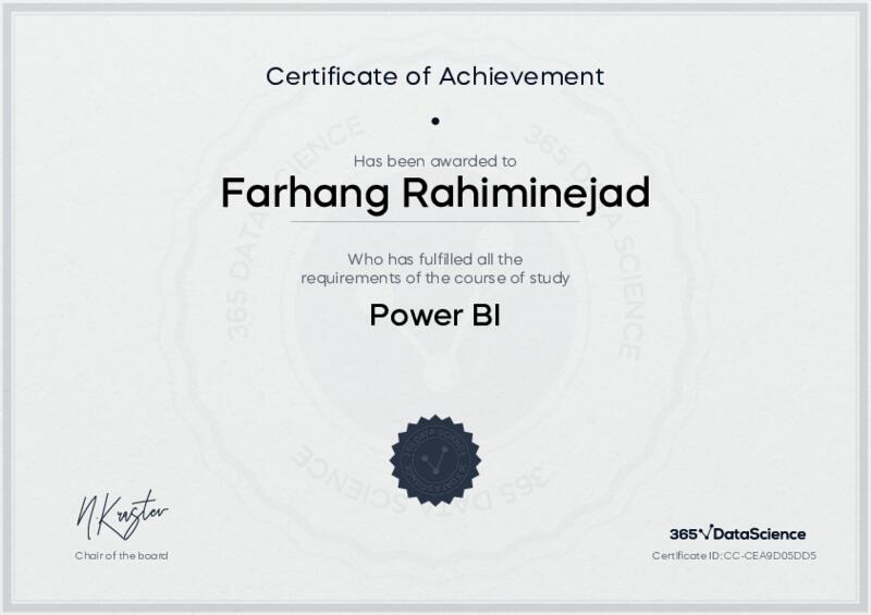 This user has been awarded the Power BI Certificate for successfully completing the course exam. Holding this certificate demonstrates their proficiency on the topic and signifies they are qualified to apply their newly acquired expertise in the fields of data analytics and data science.