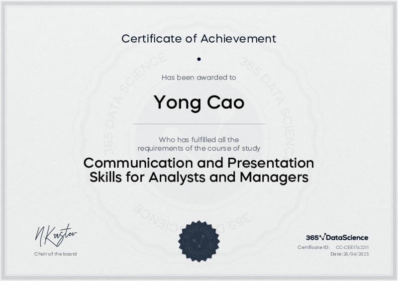 This user has been awarded the Communication and Presentation Skills for Analysts and Managers Certificate for successfully completing the course exam. Holding this certificate demonstrates their proficiency on the topic and signifies they are qualified to apply their newly acquired expertise in the fields of data analytics and data science.