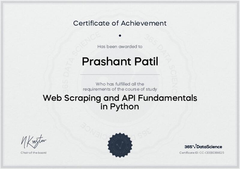 This user has been awarded the Web Scraping and API Fundamentals in Python Certificate for successfully completing the course exam. Holding this certificate demonstrates their proficiency on the topic and signifies they are qualified to apply their newly acquired expertise in the fields of data analytics and data science.