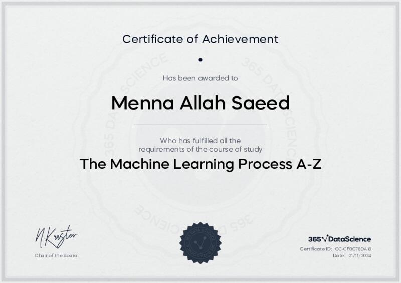 This user has been awarded the The Machine Learning Process A-Z Certificate for successfully completing the course exam. Holding this certificate demonstrates their proficiency on the topic and signifies they are qualified to apply their newly acquired expertise in the fields of data analytics and data science.