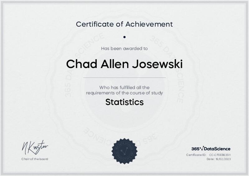 This user has been awarded the Statistics Certificate for successfully completing the course exam. Holding this certificate demonstrates their proficiency on the topic and signifies they are qualified to apply their newly acquired expertise in the fields of data analytics and data science.
