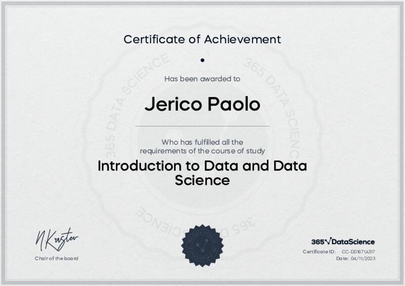 This user has been awarded the Introduction to Data and Data Science Certificate for successfully completing the course exam. Holding this certificate demonstrates their proficiency on the topic and signifies they are qualified to apply their newly acquired expertise in the fields of data analytics and data science.