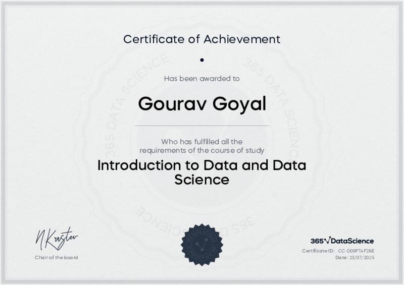 This user has been awarded the Introduction to Data and Data Science Certificate for successfully completing the course exam. Holding this certificate demonstrates their proficiency on the topic and signifies they are qualified to apply their newly acquired expertise in the fields of data analytics and data science.