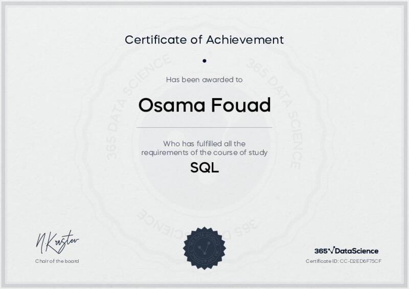 This user has been awarded the SQL Certificate for successfully completing the course exam. Holding this certificate demonstrates their proficiency on the topic and signifies they are qualified to apply their newly acquired expertise in the fields of data analytics and data science.