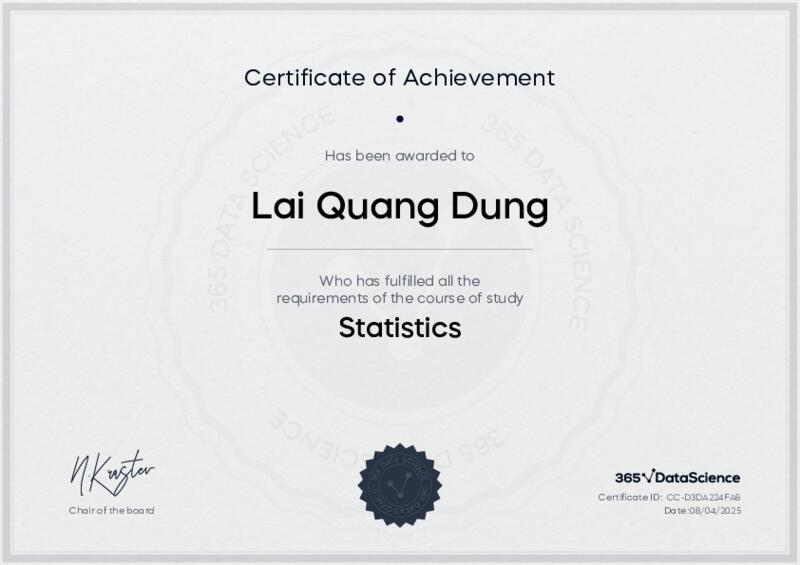 This user has been awarded the Statistics Certificate for successfully completing the course exam. Holding this certificate demonstrates their proficiency on the topic and signifies they are qualified to apply their newly acquired expertise in the fields of data analytics and data science.