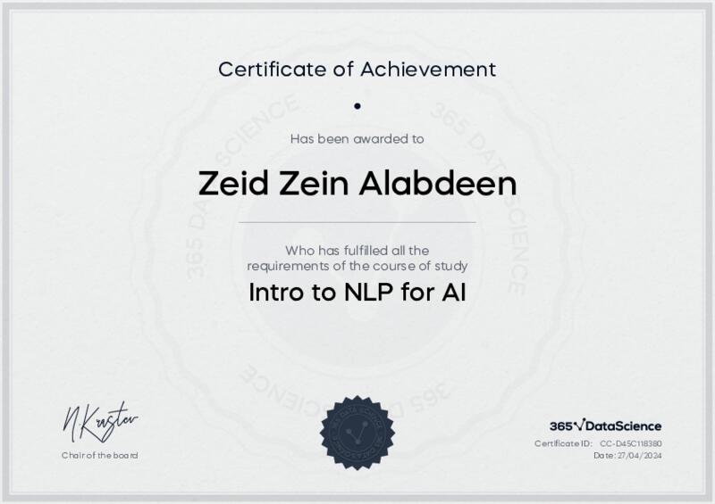This user has been awarded the Intro to NLP for AI Certificate for successfully completing the course exam. Holding this certificate demonstrates their proficiency on the topic and signifies they are qualified to apply their newly acquired expertise in the fields of data analytics and data science.