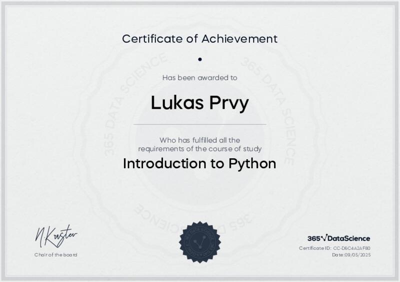 This user has been awarded the Introduction to Python Certificate for successfully completing the course exam. Holding this certificate demonstrates their proficiency on the topic and signifies they are qualified to apply their newly acquired expertise in the fields of data analytics and data science.