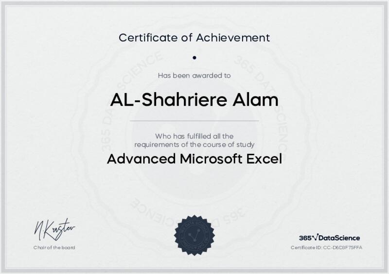 This user has been awarded the Advanced Microsoft Excel Certificate for successfully completing the course exam. Holding this certificate demonstrates their proficiency on the topic and signifies they are qualified to apply their newly acquired expertise in the fields of data analytics and data science.