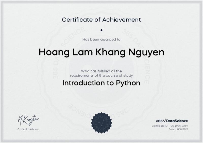 This user has been awarded the Introduction to Python Certificate for successfully completing the course exam. Holding this certificate demonstrates their proficiency on the topic and signifies they are qualified to apply their newly acquired expertise in the fields of data analytics and data science.