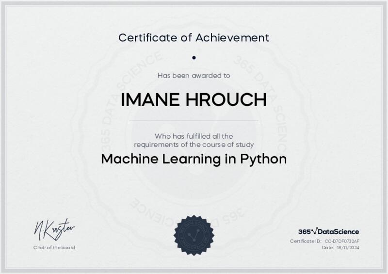 This user has been awarded the Machine Learning in Python Certificate for successfully completing the course exam. Holding this certificate demonstrates their proficiency on the topic and signifies they are qualified to apply their newly acquired expertise in the fields of data analytics and data science.