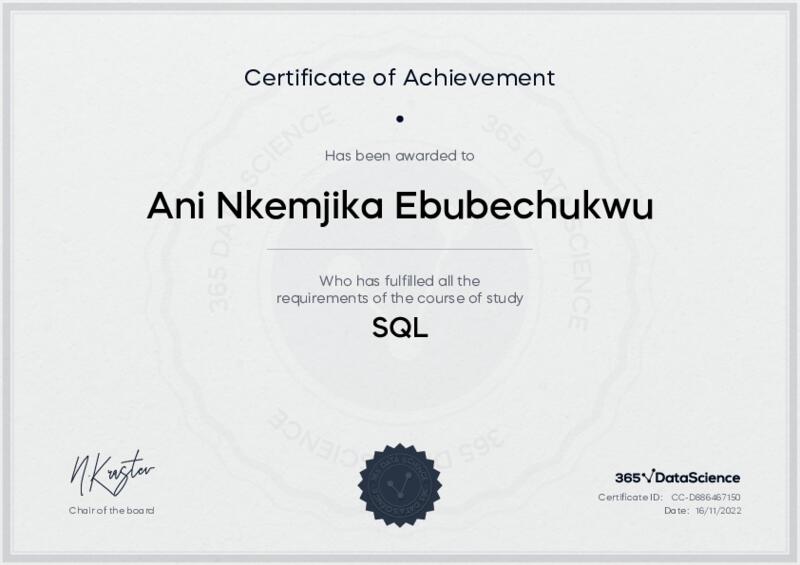 This user has been awarded the SQL Certificate for successfully completing the course exam. Holding this certificate demonstrates their proficiency on the topic and signifies they are qualified to apply their newly acquired expertise in the fields of data analytics and data science.