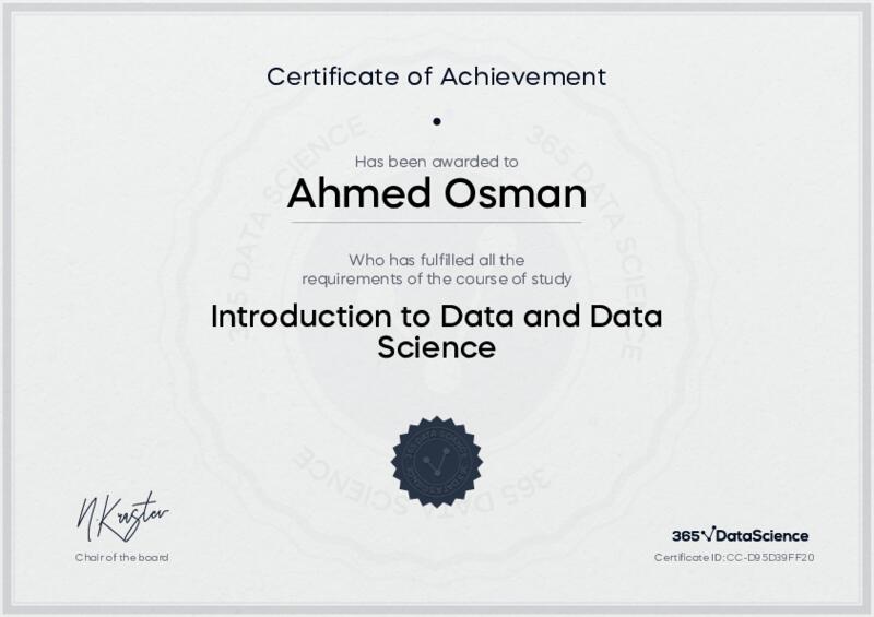 This user has been awarded the Introduction to Data and Data Science Certificate for successfully completing the course exam. Holding this certificate demonstrates their proficiency on the topic and signifies they are qualified to apply their newly acquired expertise in the fields of data analytics and data science.