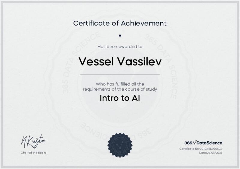 This user has been awarded the Intro to AI Certificate for successfully completing the course exam. Holding this certificate demonstrates their proficiency on the topic and signifies they are qualified to apply their newly acquired expertise in the fields of data analytics and data science.