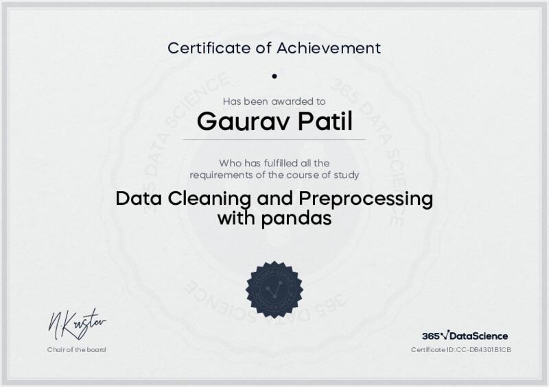 This user has been awarded the Data Cleaning and Preprocessing with pandas Certificate for successfully completing the course exam. Holding this certificate demonstrates their proficiency on the topic and signifies they are qualified to apply their newly acquired expertise in the fields of data analytics and data science.