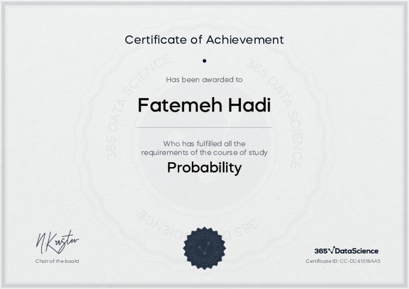 This user has been awarded the Probability Certificate for successfully completing the course exam. Holding this certificate demonstrates their proficiency on the topic and signifies they are qualified to apply their newly acquired expertise in the fields of data analytics and data science.