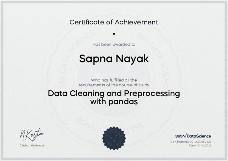This user has been awarded the Data Cleaning and Preprocessing with pandas Certificate for successfully completing the course exam. Holding this certificate demonstrates their proficiency on the topic and signifies they are qualified to apply their newly acquired expertise in the fields of data analytics and data science.
