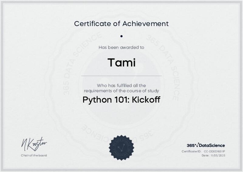 This user has been awarded the Python 101: Kickoff Certificate for successfully completing the course exam. Holding this certificate demonstrates their proficiency on the topic and signifies they are qualified to apply their newly acquired expertise in the fields of data analytics and data science.