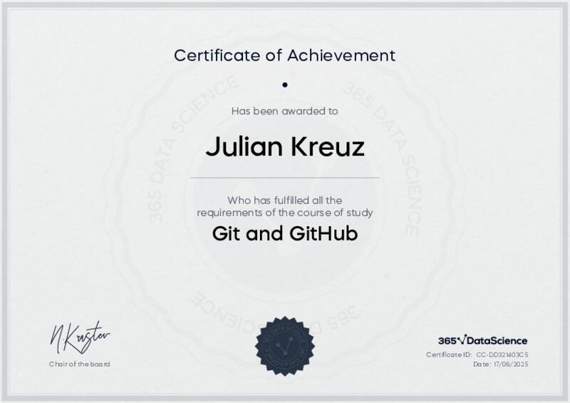 This user has been awarded the Git and GitHub Certificate for successfully completing the course exam. Holding this certificate demonstrates their proficiency on the topic and signifies they are qualified to apply their newly acquired expertise in the fields of data analytics and data science.