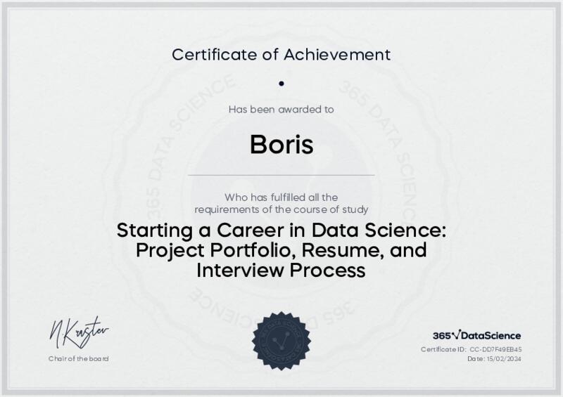 This user has been awarded the Starting a Career in Data Science: Project Portfolio, Resume, and Interview Process Certificate for successfully completing the course exam. Holding this certificate demonstrates their proficiency on the topic and signifies they are qualified to apply their newly acquired expertise in the fields of data analytics and data science.
