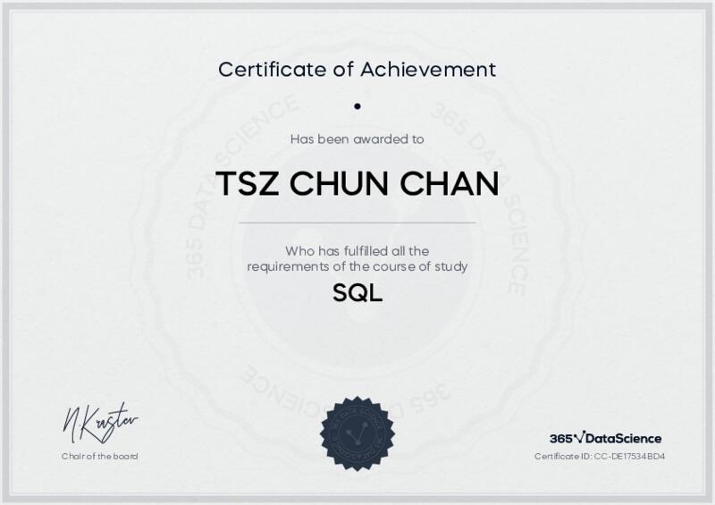 This user has been awarded the SQL Certificate for successfully completing the course exam. Holding this certificate demonstrates their proficiency on the topic and signifies they are qualified to apply their newly acquired expertise in the fields of data analytics and data science.