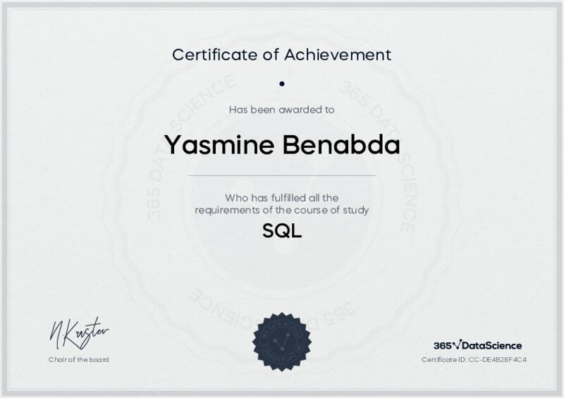 This user has been awarded the SQL Certificate for successfully completing the course exam. Holding this certificate demonstrates their proficiency on the topic and signifies they are qualified to apply their newly acquired expertise in the fields of data analytics and data science.