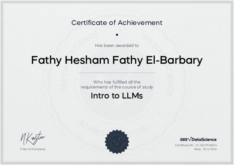 This user has been awarded the Intro to LLMs Certificate for successfully completing the course exam. Holding this certificate demonstrates their proficiency on the topic and signifies they are qualified to apply their newly acquired expertise in the fields of data analytics and data science.