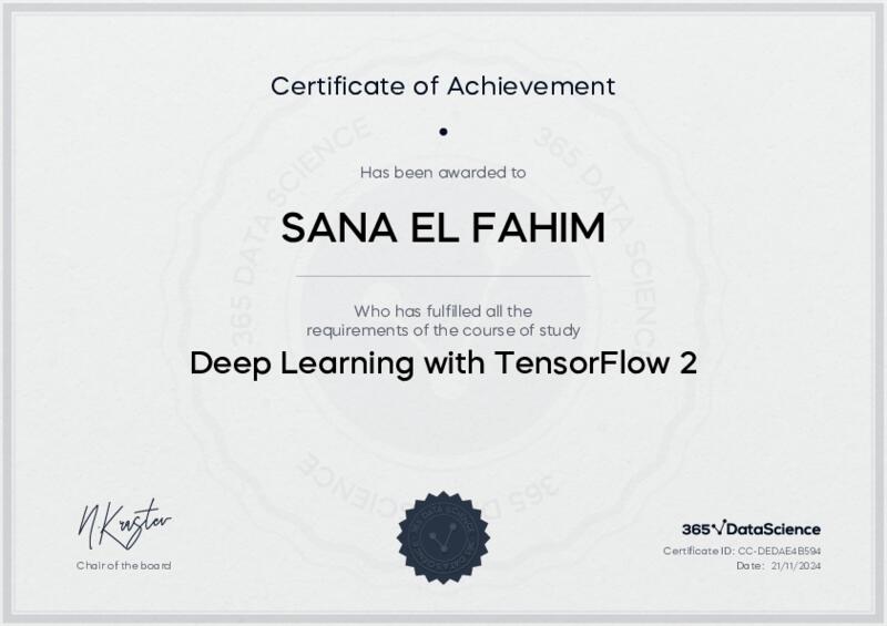 This user has been awarded the Deep Learning with TensorFlow 2 Certificate for successfully completing the course exam. Holding this certificate demonstrates their proficiency on the topic and signifies they are qualified to apply their newly acquired expertise in the fields of data analytics and data science.