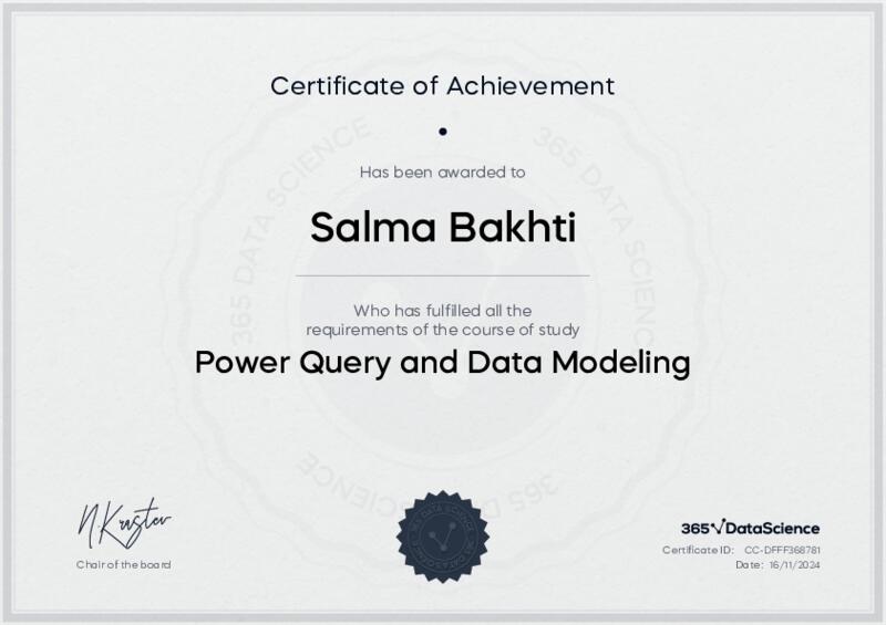 This user has been awarded the Power Query and Data Modeling Certificate for successfully completing the course exam. Holding this certificate demonstrates their proficiency on the topic and signifies they are qualified to apply their newly acquired expertise in the fields of data analytics and data science.